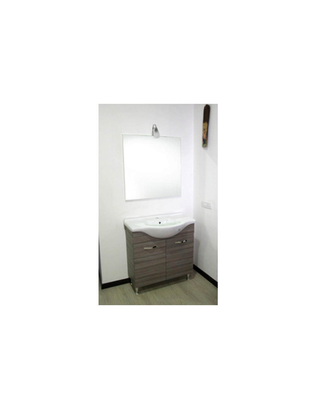 in MDF ricoperto di PVC Mobile due ante. Completo di specchio con illuminazione e lavabo integrale (rubinetto escluso). Dimensioni base 82 x 35 x h 84 cm. Dimensioni specchio 68 x h 80 cm. Colore palissandro