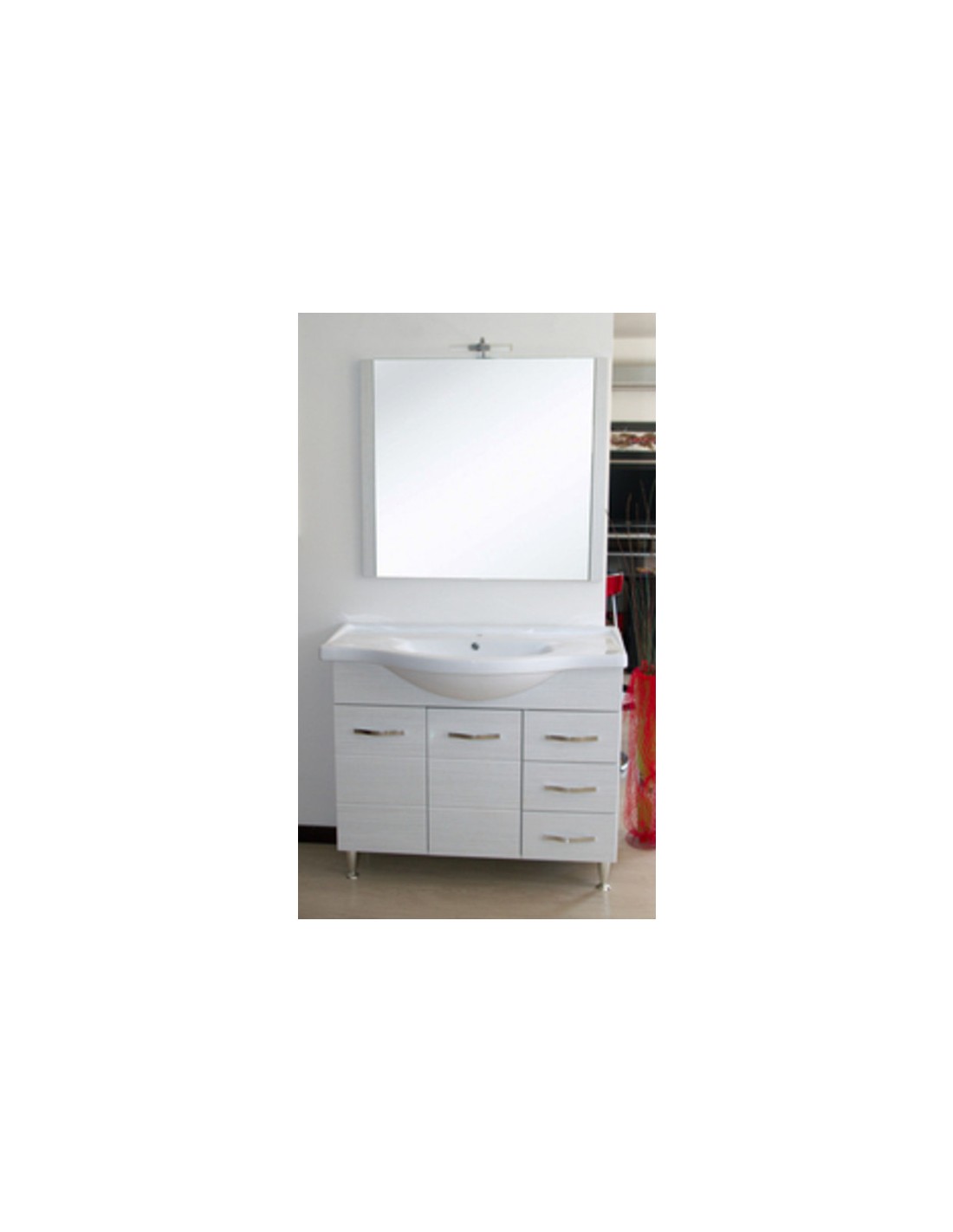 in MDF ricoperto di PVC. Mobile due ante e tre cassetti. Completo di specchio con illuminazione e lavabo integrale (rubinetto escluso). Dimensioni base 100 x 35 x h 87 cm. Dimensioni specchio 90 x h 80 cm. Colore bianco portuna.