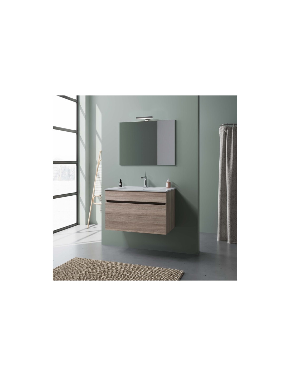 Frontali in melaminico bordato in ABS, laterali in truciolare nobilitato. Mobile sospeso con un cassettone. Completo di specchio con illuminazione led e lavabo integrale (escluso rubinetto). Dimensioni base 80 x 46 x h 50 cm. Dimensioni specchio 80 x h 60 cm. Colore rovere fumo.