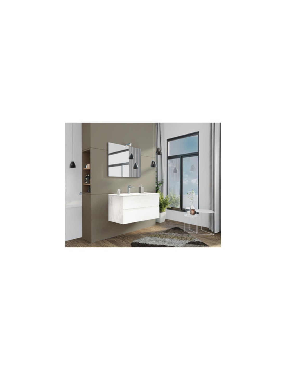 mobile sospeso dalla struttura in legno a due cassettoni su guide a chiusura assistita, lavabo in ceramica integrale (miscelatore non incluso) e specchio con illuminazione led. Dimensioni base 101 x 44 x h 53 cm, specchio 80 x h 60 cm. Colore bianco lucido