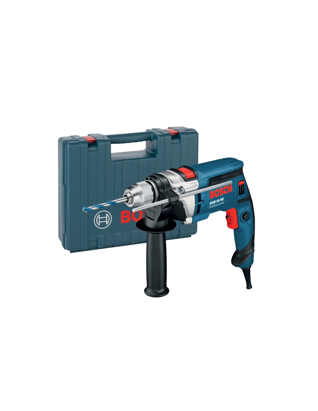 Mod. GSB 16 RE Potenza 750W. Velocit a vuoto 2800 giri/min. Percussioni 47600 colpi/min. Coppia di serraggio 18 Nm. Mandrino autoserrante 1,5 - 13 mm. Foratura legno 30 mm, metallo 13 mm. muratura 18 mm. Reversibile. In dotazione impugnatura supplementare, limitatore di profondita 210 mm, Valigetta. Dimensioni 285x83xh214 mm. Peso 2,200 kg